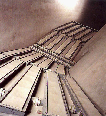 連續(xù)式均化庫可采用庫底或庫側(cè)卸料,每庫應(yīng)有兩個及以上卸料門,選用配有手動檢修閘門、快速開閉閥和流量控制閥的卸料裝置,對卸料、清庫比較有利。
